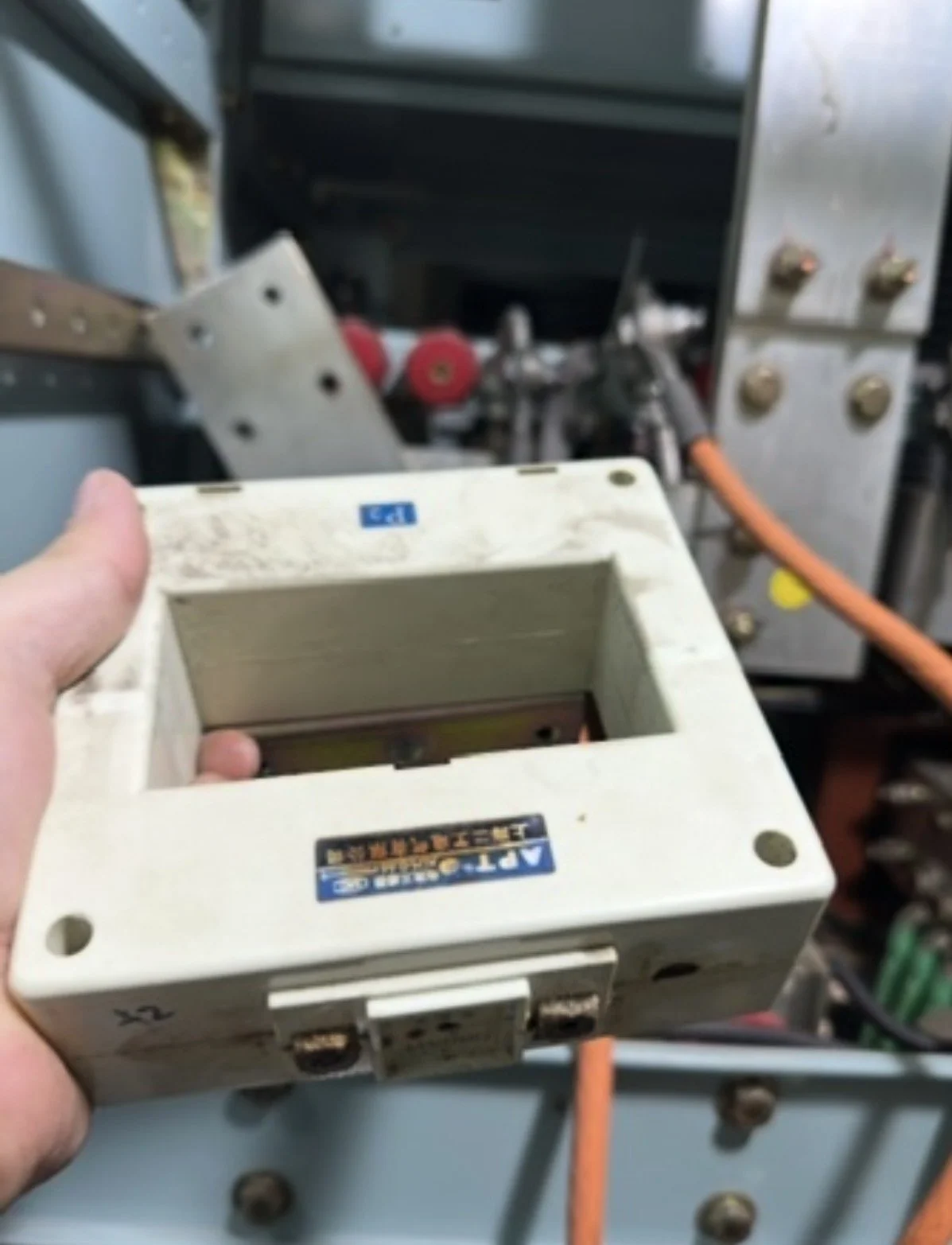 Defective Current Transformer (CT) This unit was removed after exhibiting significant saturation issues that compromised the accuracy of the vessel’s power metering. A defective CT like this provides false current readings to the Power Management System, leading to dangerous load imbalances and synchronization failures. Replacing this unit was vital to restoring the electrical integrity and operational safety of the Main Switchboard.