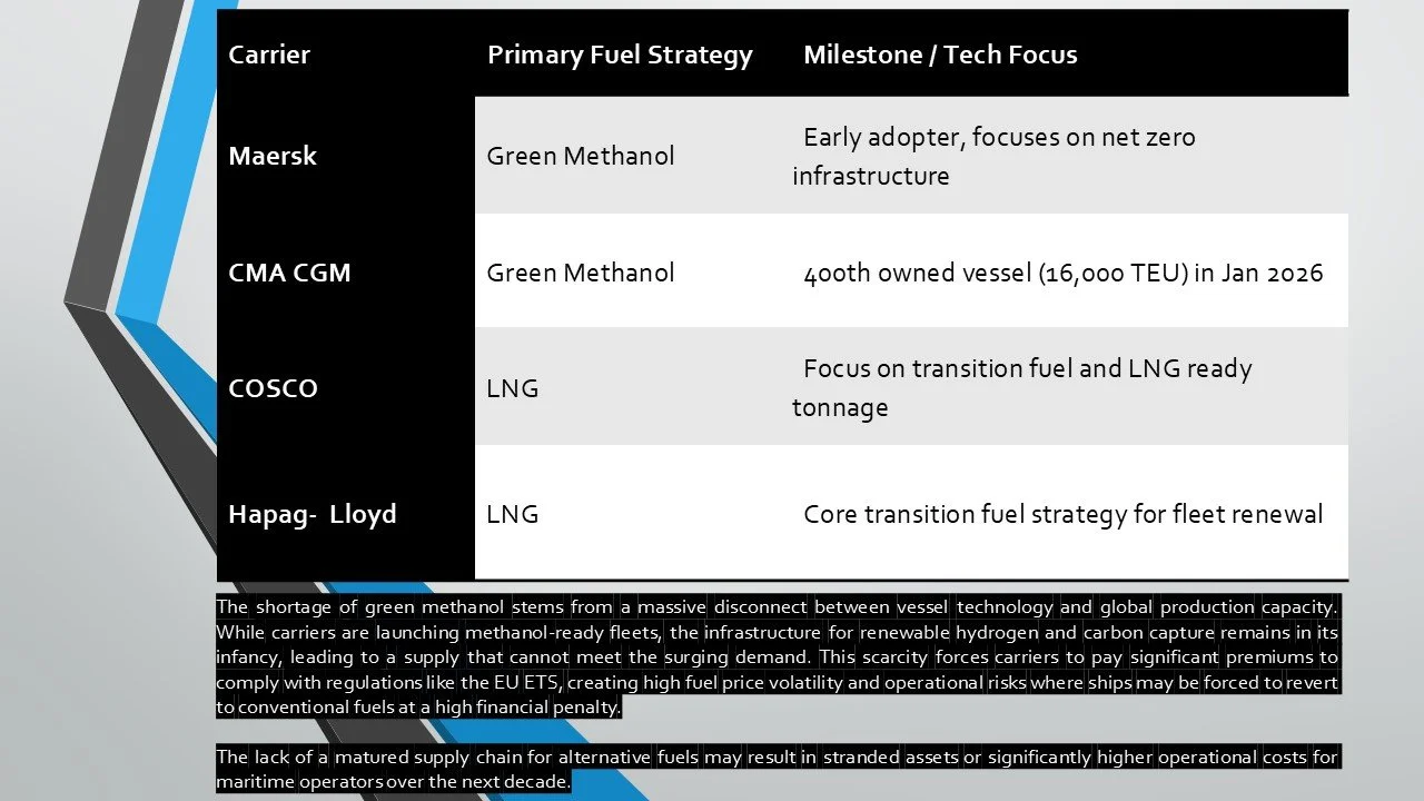 The graph illustrates the Strategic Realignment of Alternative Fuel Adoption across major carriers as of 2026. It highlights the industry’s bifurcation into two distinct technological pathways for decarbonization. The Strategic Realignment of Alternative Fuel Adoption across major carriers as of 2026. It highlights the industry’s bifurcation into two distinct technological pathways for decarbonization.