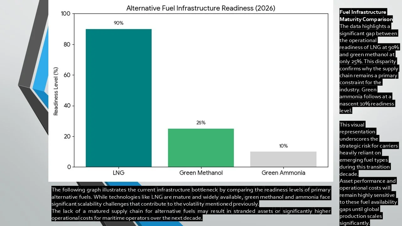 The low readiness levels for green methanol and ammonia suggest that fuel availability will remain the primary operational constraint for deep-sea decarbonization efforts through the next decade.The graph depicts the Alternative Fuel Infrastructure Readiness as of 2026, highlighting the significant gap between theoretical adoption and physical bunkering availability.Volume vs. Integration