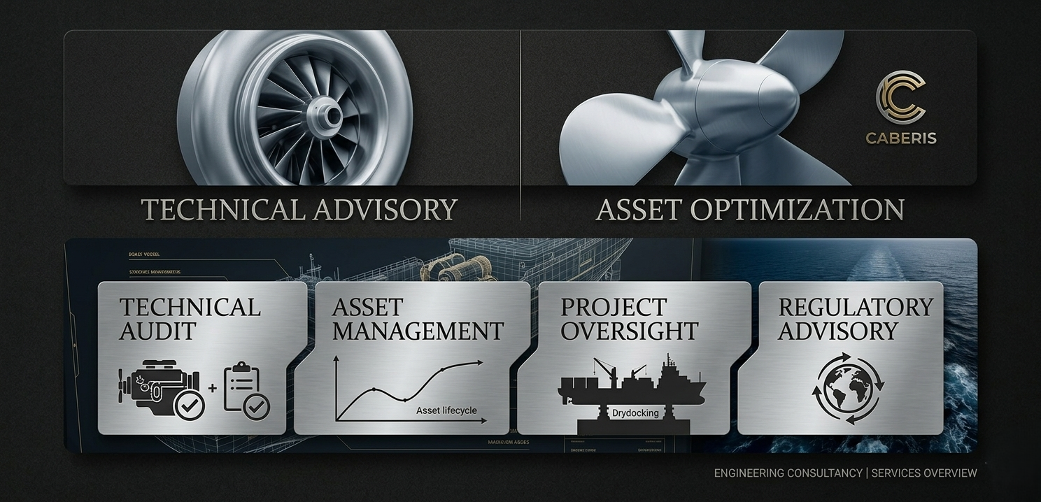 Caberis provides specialized consultancy services focused on the lifecycle and performance of complex maritime systems. Our approach combines deep technical knowledge with strategic oversight to minimize risk and maximize operational availability.